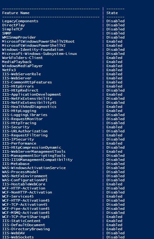 In keeping with the smaller scripts responsible for a specific aspect I created a small PowerShell Script called Install_IIS.ps1. That script looked something like this. Please note, these are the features my team needed to do local IIS development, I highly recommend you go through the list provided by DISM's Get-Features functionality and which ones you need.