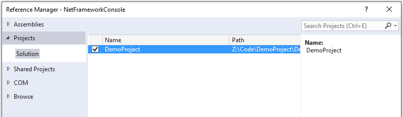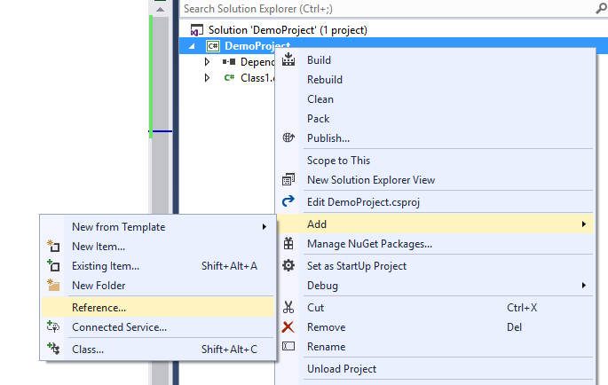 In the demo solution I added a console application targeting .NET 4.6.2. Adding a reference to this demo library is the same as any other class library reference. Right click on the project, select add reference.