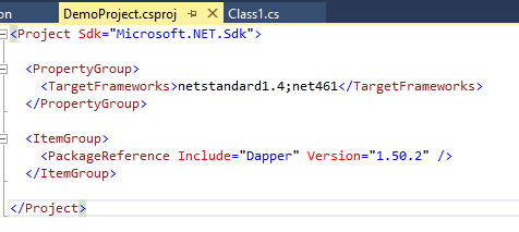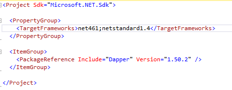 Why target multiple frameworks? It is a matter of what will be brought in. This library is going to be a small wrapper around Dapper. If the library just targeted .NET Standard 1.4 and I wanted to use library as a NuGet package in a console application written in .NET 4.6.2 then that console application would have to reference the .NETStandard.Library Nuget package. That, in turn, brings in what feels like half the world of NuGet references.
