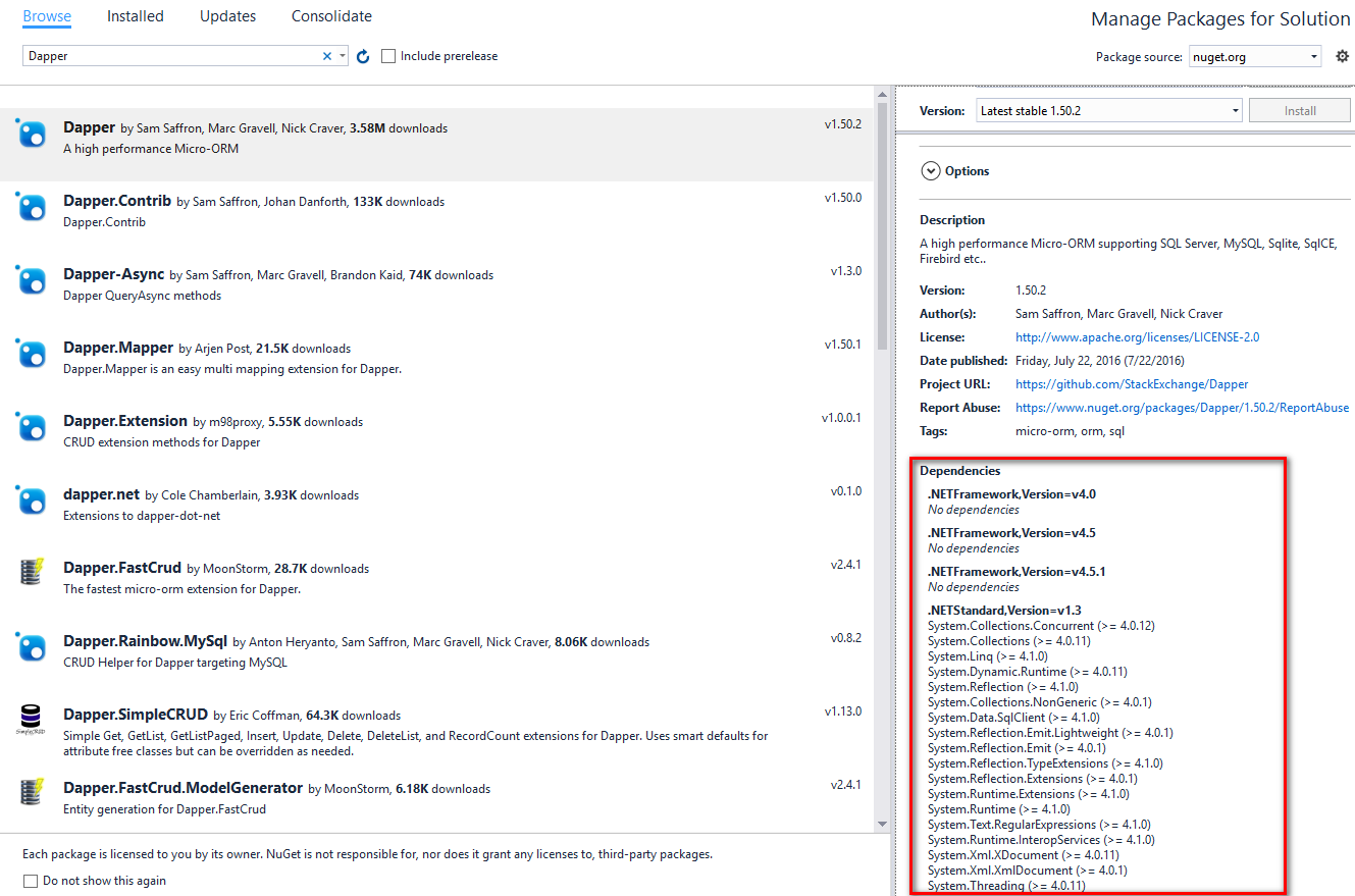 Anyway, open up the NuGet package manager and enter in Dapper. Notice the right side of the screen. This tells us that Dapper can be used in both .NET Framework and .NET Standard libraries. It also shows us the minimum version for this class libary must be .NET Standard 1.3 The library can then target any .NET Standard version greater than or equal to .NET Standard 1.3.
