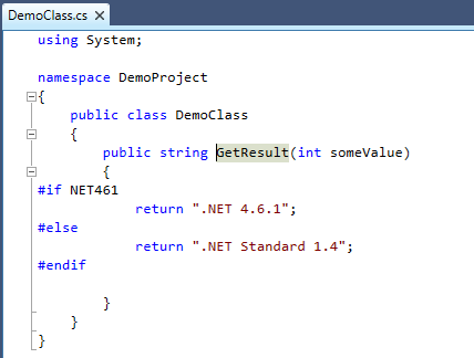 Note: Again, this is why it is recommended to avoid using preprocessor directives whenever possible. The results are too unexpected. Keeping the target frameworks paired (.NET Standard 1.4 and .NET Framework 4.6.1 for example) help keep the need for preprocessor directives down.