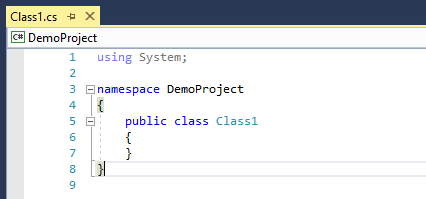After Visual Studio finishes the initial setup the project will load and the Class1 file will appear. Do not be surprised if at first, the file says it cannot compile and the code appears as red for a brief moment. Visual Studio is doing some work behind the scenes. Wait a minute or two and it goes away.