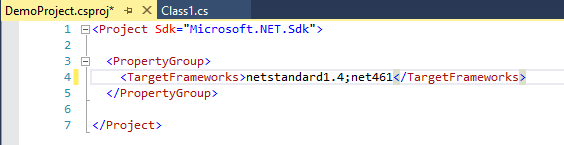 Since we are in the project file, now is a good time to talk about targeting multiple frameworks in a single project file. As you can see, the project is targeting .NET Standard 1.4.