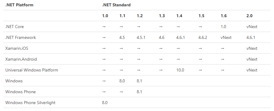 Basically, it works out like this. The idea being if the project can work in .NET Standard 1.1 then it sure as heck can work in .NET 4.5. It doesn't work the other way around, writing a library in .NET 4.5 does not mean it will work with .NET Standard 1.1.