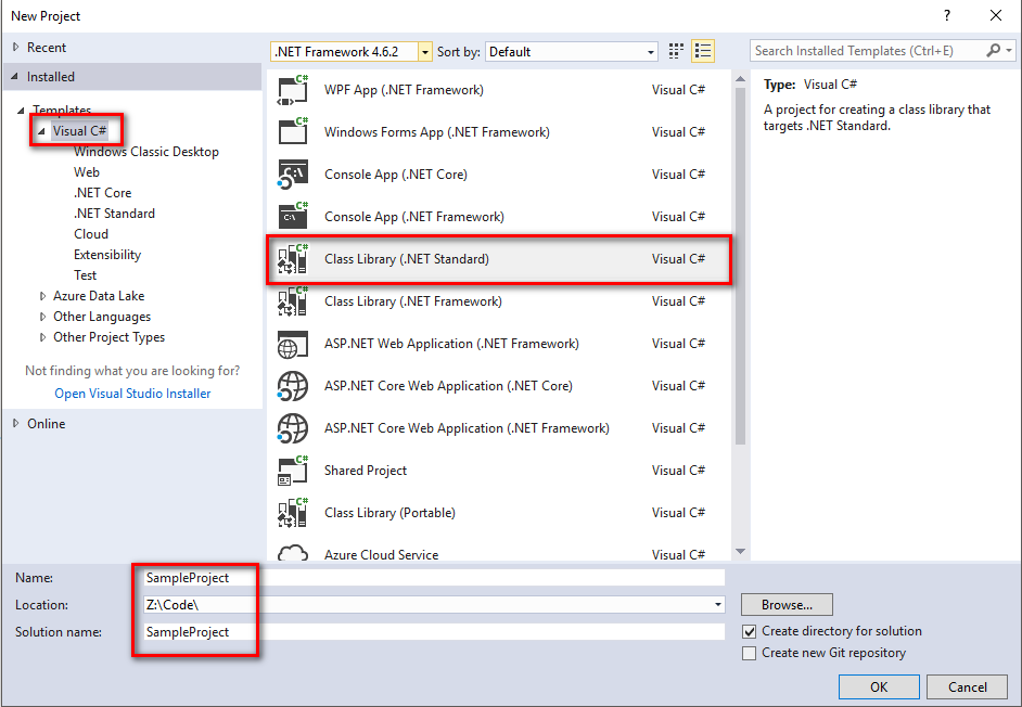 When the New Project modal appears select Visual C# in the left menu. Then select Class Library (.NET Standard) and enter a location for the project.