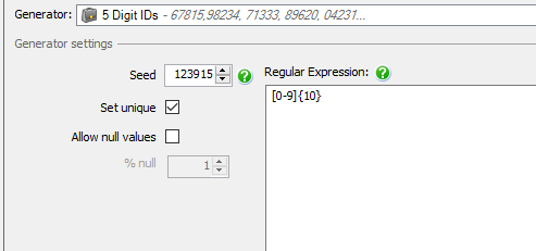 For other columns such as the street number or zip code, you can select Business -> 5 Digit IDs. This creates a predefined regular expression. In the screenshot below I changed it to generate a ten digit number.