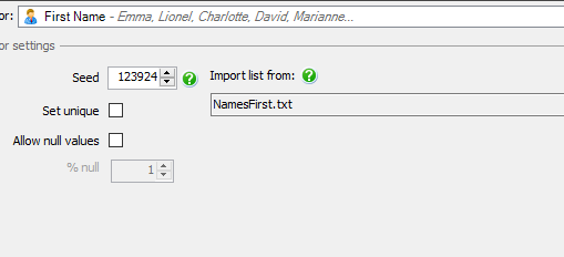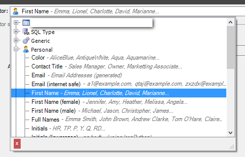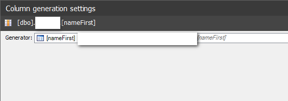 In this example, we will be using the NameFirst column. If you click on the text box next to the label "Generator", you will be presented with an extensive drop-down list. Because this is for first names select Personal -> First Name