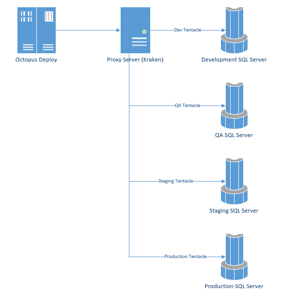 - Separation of duties -> the proxy server is only used for SQL Server deployments while keeping that work off of SQL Server as well the Octopus Deploy Server. If one tentacle decides to crash the system it doesn't bring down SQL Server or Octopus deploy, it just stops database deployments.