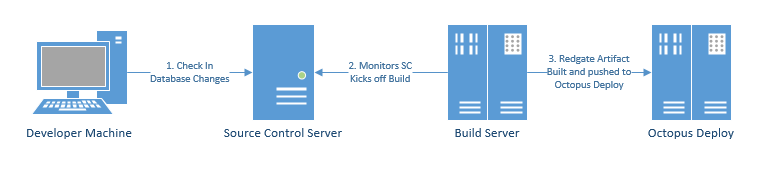 The CI Server (or build server), will generate an artifact using the Redgate DLM Automation build step. This artifact is the desired state of the database, it includes the entire schema definition of a database. That artifact is sent to Octopus Deploy to handle the deployment steps through each environment.